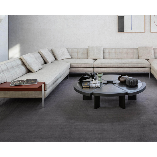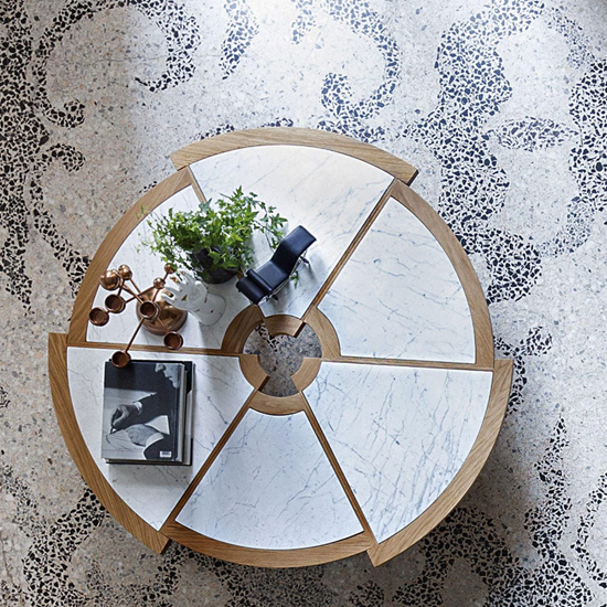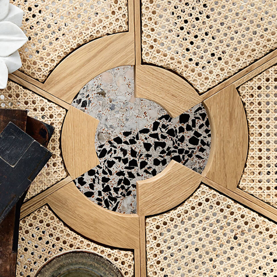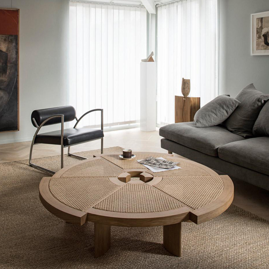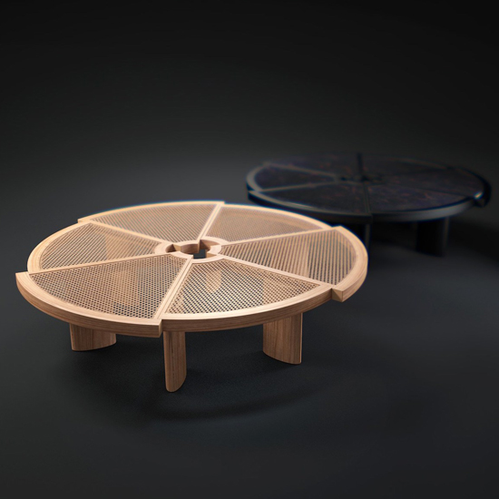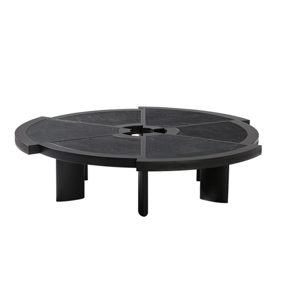 Design : Charlotte Perriand. Année de conception : 1962. Table ronde constituée de six sections à quartiers juxtaposés, non alignés et de rayons différents, avec le bord extérieur en chêne naturel massif ou bien en chêne teinté noir à pores ouverts. Les six sections décalées qui constituent la table avec un trou central sont proposées en trois finitions différentes : en rotin avec les bords en chêne naturel, en marbre de Carrara blanc avec les bords en chêne naturel, en marbre Marquiña noir avec les bords en chêne teinté noir à pores ouverts. La base de la table est constituée de six supports dans les mêmes finitions que les bords. Cette table fut conçue par Charlotte Perriand en deux dimensions différentes. La réédition de Cassina est celle du premier projet de 1962, pour l’habitation de Jacques Martin à Rio. Successivement, elle adapta cette table pour l’Ambassade du Japon à Paris, en lui donnant des dimensions plus grandes.