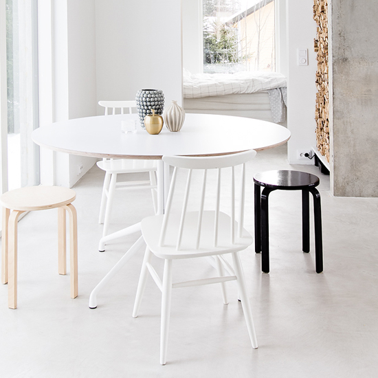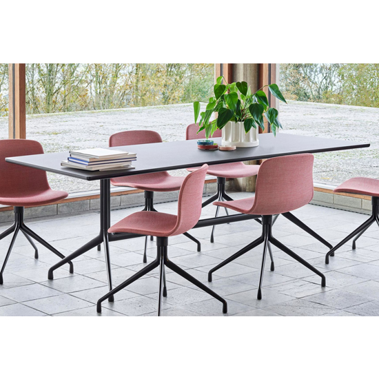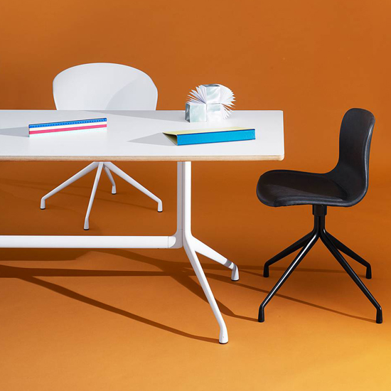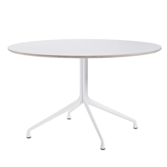 Armature faite d’aluminium moulé sous pression disponible en blanc ou noir. Le dessus de table est faite de 26 mm linoléum noir ou contreplaqué stratifié blanc. Disponible en 9 tailles différentes.