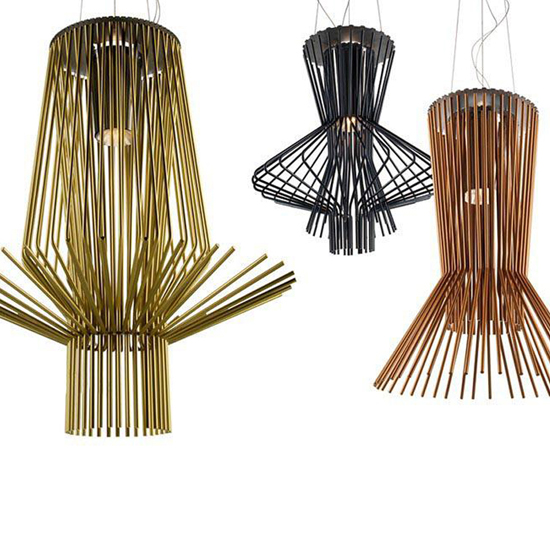 Lignes situées l’une à côté de l’autre qui, dans un équilibre presque magique, suspendu, créent une symphonie fascinante et raffinée, en donnant naissance à une lampe destinée à caractériser des pièces aux dimensions importantes, publiques comme privées. Possibilité double allumage. Existe dans 2 autres formats et coloris.
