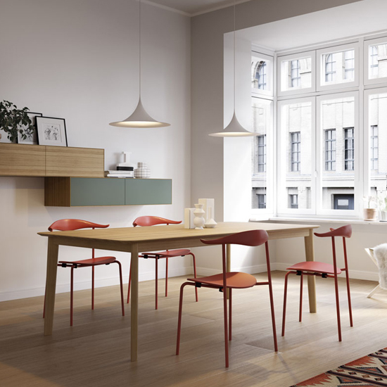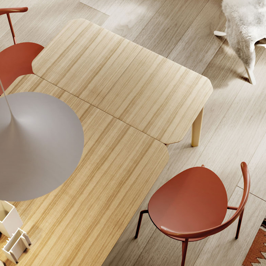 Design : Ibon Arrizabalaga. La table Ari, avec ses pieds en bois massif et ses bords arrondis, rappelle les tables traditionnelles en bois massif mais avec une touche contemporaine grâce aux quatre coins chanfreinés. Il existe également une version extensible de cette table. Une fois la table Ari étendue, les quatre pieds restent dans les coins et ne dérangent pas les convives.