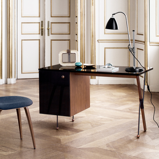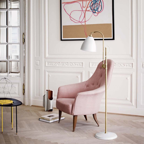 Design : Robert Dudley Best. Matériaux : Laiton – Abat-jour et base : métal thermolaqué et câble entouré de textile. Hauteur réglable. Version lampe à poser, lampadaire ou applique. Plusieurs coloris au choix.