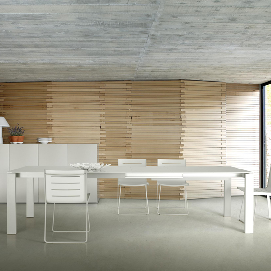 Design : Claudio Dondoli & Marco Pocci. Table de repas télescopique à 3 allonges pour 6 à 12 personnes. Piétement en acier laqué mat (2 pieds équipés de patins glisseurs côté ouverture et 2 pieds munis de patins anti-glisse côté fixe). Cadre en aluminium anodisé face interne et laqué mat sur les faces visibles. Plateau monobloc en verre extra clair trempé laqué, épaisseur 10 mm ou plateau monobloc en aluminium laqué mat allégé (intérieur mousse polyuréthane). Trois allonges (rangées à l’intérieur de la table) en aluminium laqué mat allégé (intérieur mousse polyuréthane) de 50 cm chacune, permettent d’agrandir à volonté la longueur de la table de 150 à 200, 250 ou 300 cm.