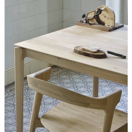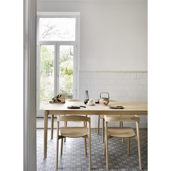 Comme la chaise Bok, la table Bok d’Ethnicraft a une forme aérée, mais une construction solide comme un roc grâce à un piètement et un plateau en chêne massif. Ethnicraft travaille exclusivement du chêne provenant de forêts européennes. Toujours à la recherche de la beauté authentique, Ethnicraft a sélectionné du bois contenant des noeuds et des fissures naturelles qui font de chaque pièce une pièce unique. Les meubles en chêne sont au préalable teintés à l’aide d’un produit à base d’eau puis huilé.