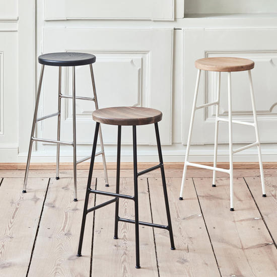 Design : Jonas Trampedach. Le tabouret de Cornet de Jonas Trampdach est un tabouret de bar classique utilisant une technique innovatrice de tube en acier inspirée par des supports à bicyclettes. Le siège rond en chêne massif repose sur une base en acier mince, créant un équilibre intéressant des proportions et des profils. Les tabourets viennent dans deux tailles différentes, avec le choix des finitions en bois pour le siège et le chrome ou les options de couleur enduites pour les pieds. Les tabourets conviennent aux bars et aux îlots dans un certain nombre de paramètres privés et publics.