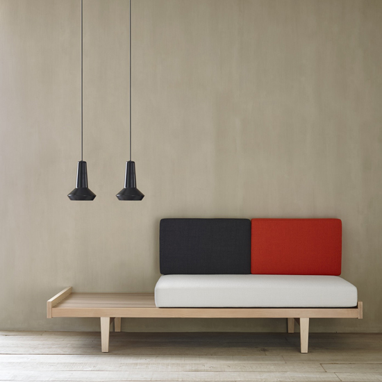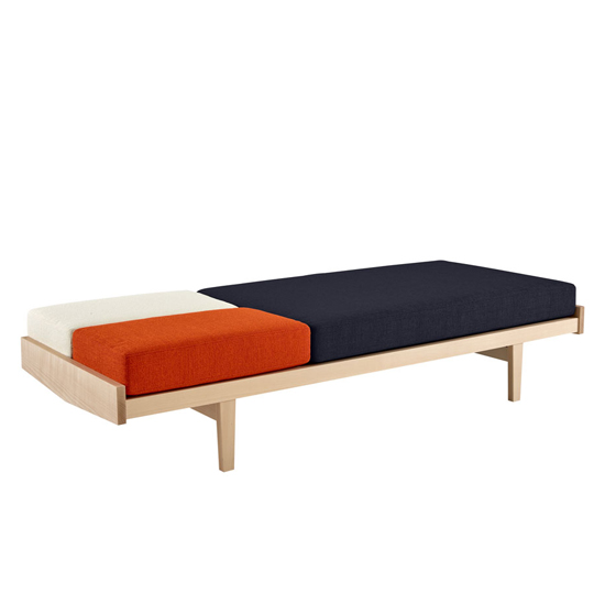 Design : Pierre Paulin. Révolutionnaire sur le marché français du début des années 50, l’élégance minimale de la banquette Daybed a toutes les chances de rencontrer encore plus de succès aujourd’hui où les regards se sont formés depuis des décennies à cette économie de formes. Nouvelle sensibilité aux matériaux naturels tels le bois, retour à une « low-consommation » centré sur des produits justes et essentiels, nostalgie des fifties et retour en grâce du design scandinave sont autant de facteurs d’attractivité actuelle pour cette banquette. Conçue comme un petit canapé avec table basse intégrée, elle devient une grande banquette pour 3/4 personnes (ou même un lit d’appoint pour une personne) lorsqu’on positionne les deux coussins de dos sur la table basse à la suite du coussin d’assise.