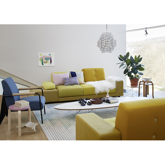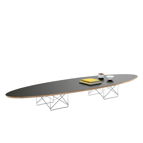 Design : Charles & Ray Eames, 1951. Avec sa silhouette elliptique élégante, cette table basse a rapidement été surnommée « Surfboard Table » (planche de surf) en raison de sa forme. Dotée d’un piètement double en finition chromée et d’un plateau laminé noir ou blanc, la construction de la table reprend un thème récurrent dans le travail des Eames, à savoir le fil d’acier courbé et soudé pour former une structure stable.