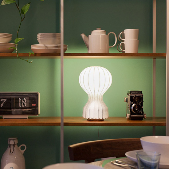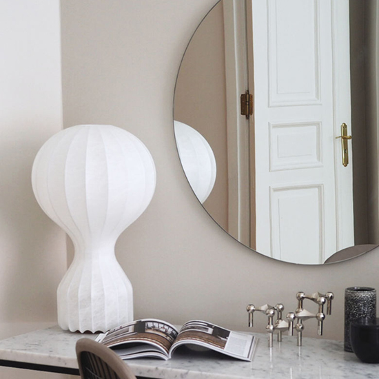 Design : Achille Castiglioni. Gatto est une lampe de table dessinée par Achille et Pier Giacomo Castiglioni pour Flos. Cette lampe se compare à une montgolfière prête à décoller. On la trouve aérienne et légère grâce à son diffuseur en coton. Allumée, on lui trouve un ressemblance à une lanterne. Structure acier & diffuseur en coton. Coloris blanc, 1 ampoule halogène 42W E14 , variateur fourni. 2 tailles disponibles.