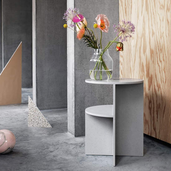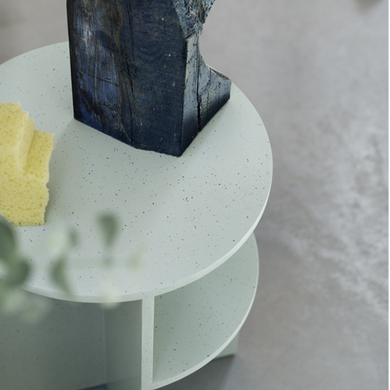 Design : MSDS Studio. Faite d’une combinaison unique d’acrylique et de pierre, la table d’appoint Halves est une table d’affichage sculpturale qui convient à tous les environnements. à côté du lit ou du canapé, dans un couloir ou un bureau.