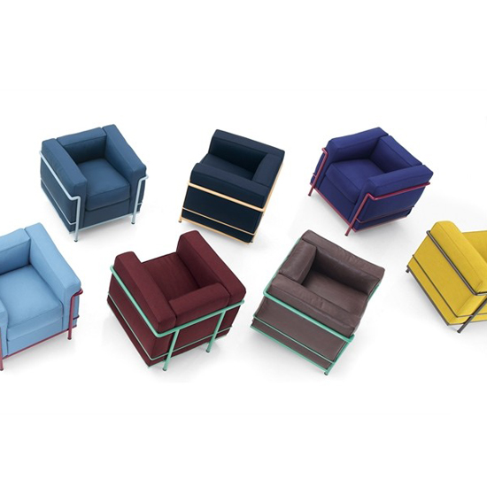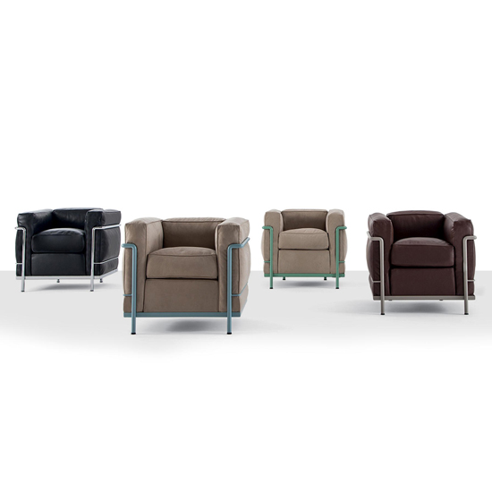 Fauteuil, canapés à deux ou bien trois places et pouf à structure en acier chromé trivalent (CR3) brillant ou laqué dans les couleurs suivantes : gris, bleu, vert, havane, taupe, ivoire ou noir semi-brillants. Coussins indépendants à rembourrage en mousse de polyuréthane expansé et ouate de polyester ou en plume (à l’exception du pouf), âme en polyuréthane expansé. Revêtement en cuir ou tissu; tissue microfi bre pour la version à structure chromée. Un modèle intemporel qui a fait l’histoire du design. Dessiné en 1928, c’est l’archétype du fauteuil moderne. La séparation entre le châssis de la structure et le coussinage est la pleine expression de la logique du rationalisme. Un classique.