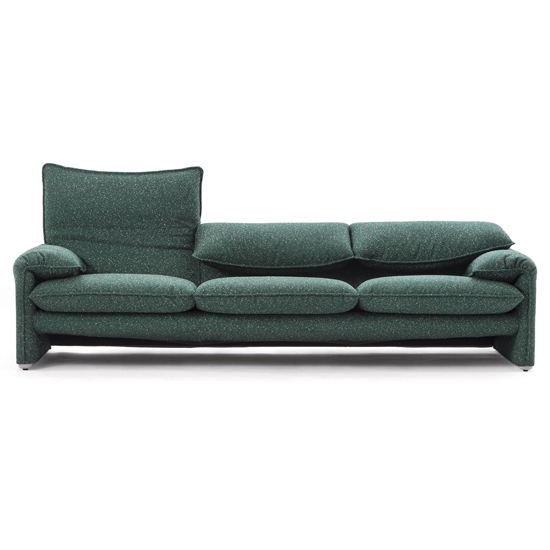 Design Vico Magistretti. Fauteuil, pouf et canapés à deux ou trois places. Structure en acier et socles en plastique de couleur noire. Rembourrage en mousse de polyuréthane expansé sans CFC et ouate de polyester. Coussin d’assise en polyuréthane expansé et ouate de polyester. Dossier muni d’un appuie tête escamotable qui permet l’utilisation aussi bien en version basse qu’en version haute, à convertibilité immédiate. Sur les canapés l’appuie tête est individuel et indépendant pour chaque place assise. Revêtement en tissu ou en cuir.