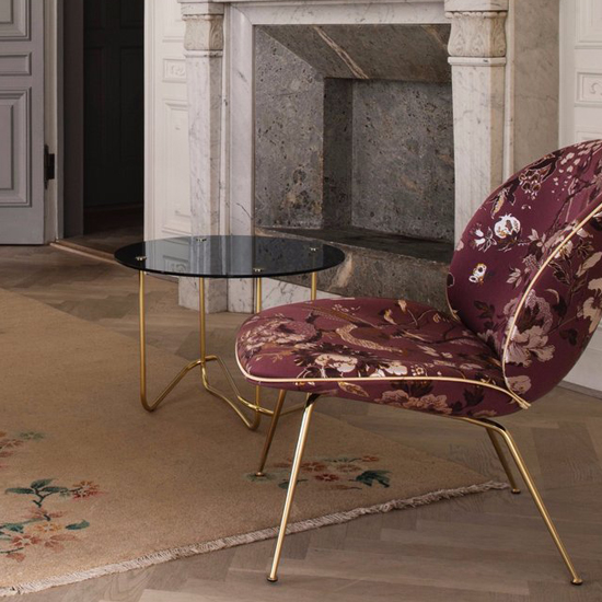 Design : Mathieu Matégot. La table Lounge dessinée par Mathieu Matégot en 1960 est à la fois organique et tendance. Le laiton contraste avec le verre fumé et s’adapte à tout style de décoration. Le tube donne l’impression de tourner sur lui même et de surélever la table.