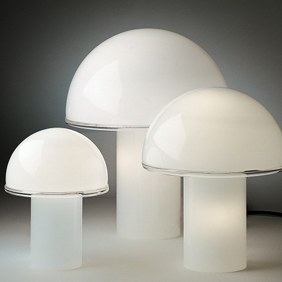 Design Luciano Vistosi. Corps et diffuseur en verre soufflé opalin blanc. Bordure du diffuseur en cristal transparent. Disponible en trois dimensions. Emission de lumière diffuse.