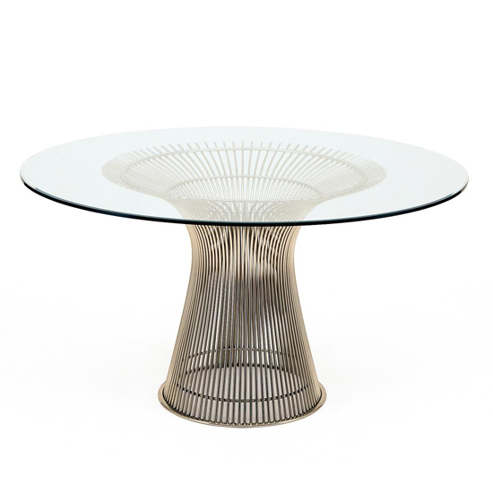 Design : Warren Platner. La table Platner, en illustration, icône du design conçue dans les années 60 par Warren Platner est rééditée par la maison Knoll International. La table Platner fait partie d’une collection de mobilier sculptural qui ne peut que faire vibrer votre intérieur. Très accroche-regard en harmonie avec le Fauteuil Platner et le tabouret Platner, la table Platner sublime l’aménagement des salles à manger et confère aux bars, hôtels et restaurants une élégance sixties toute particulière. Le piètement du Fauteuil Platner est composé d’un faisceau de fils d’acier cintrés, soudés sur des cadres cintrés horizontaux en acier profilé à froid qui lui confèrent sa forme caractéristique. La base du piètement est un anneau de protection en profilé plastique, transparent.