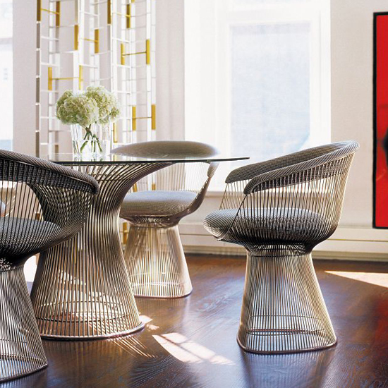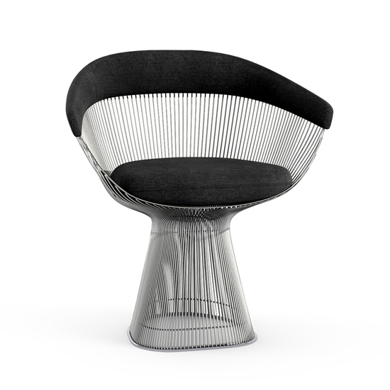Design : Warren Platner. En 1966, Warren Platner dessine une collection de mobilier, devenue iconique, qui se caractérise par une silhouette sculpturale. En transformant de simples tiges d’acier, l’architecte et designer donne naissance à une collection élégante de sièges et de tables avec une base formée de faisceaux de fils d’acier. Edité par Knoll, le petit fauteuil Platner offre un confort généreux, parfait pour la salle à manger, associé par exemple à la table de la même collection.