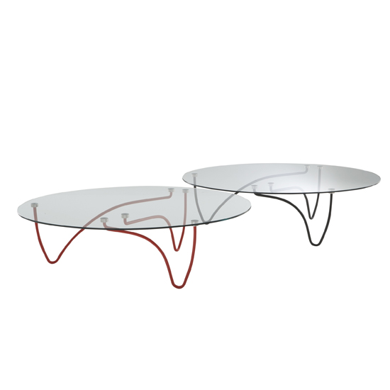 Design : Angie Anakis. Plateau en verre clair trempé épaisseur 8 mm. Piétement en rond d’acier de diamètre 15 mm laqué finition mat. Des platines (diamètre 35 mm) sont collées sous le plateau pour recevoir le piétement.