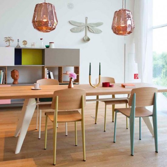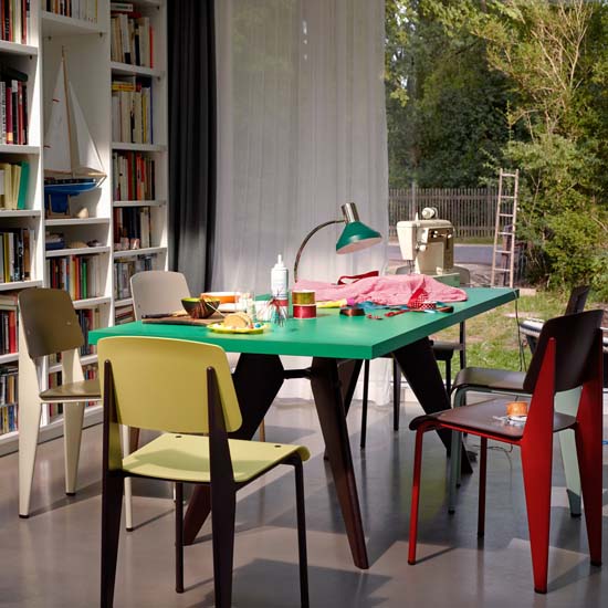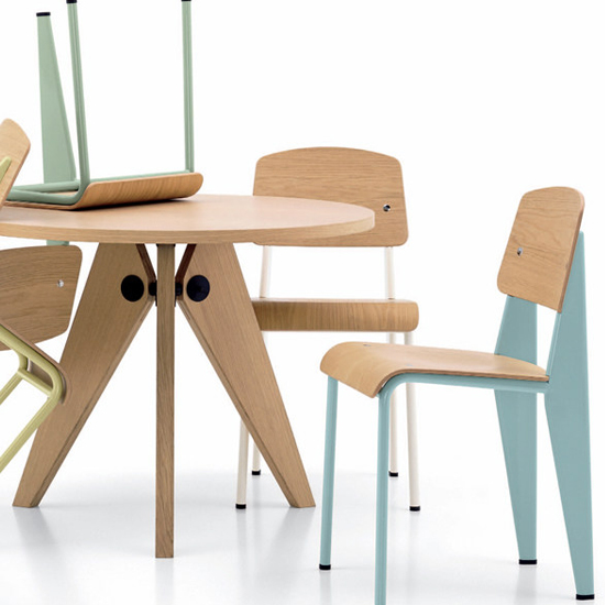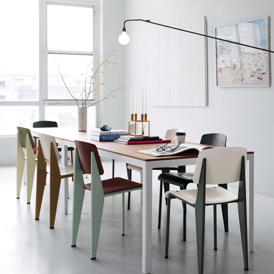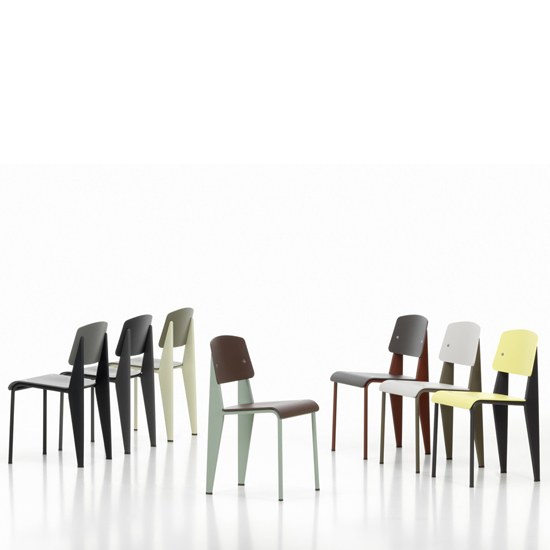 Design : Jean Prouvé. L’ingénieur et designer Jean Prouvé a produit ses créations dans son propre atelier à Nancy et a ainsi pu mettre en œuvre facilement les demandes des clients et les modifications des produits. De nombreuses variantes de ses meilleures créations ont donc été développées au fil des ans. Tel est le cas pour la chaise Standard qui a été réalisée en diverses versions pour différents projets d’aménagement intérieur. L’une de ces variantes, la chaise Standard SR (siège rembourré), est dotée d’une assise et d’un dossier rembourrés. L’apparence de la chaise Standard SR traduit les charges statiques en jeu de manière caractéristique des travaux de Prouvé : tandis qu’un tube d’acier est utilisé pour les deux pieds avant qui sont moins sollicités, les pieds arrière de la chaise sont constitués de corps creux volumineux. Le coussin légèrement rembourré est soigneusement intégré à la structure de la chaise Standard SR, améliorant ainsi son confort d’assise. Le revêtement en tissu se décline en différentes couleurs, tout comme le piètement de la chaise, disponible en nuances variées. La chaise Standard est également disponible en version classique avec assise et dossier en bois ou comme modèle Standard SP avec assise et dossier en matière plastique robuste.